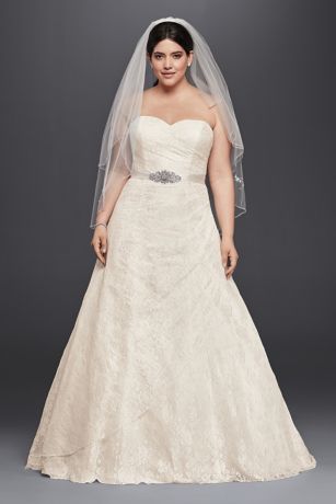 Looking for the perfect romantic customizable look? Look no further than this allover lace plus size wedding dress with an A-line, side drape skirt and sweetheart neckline. Tie on a sash to take this classic look up a notch.