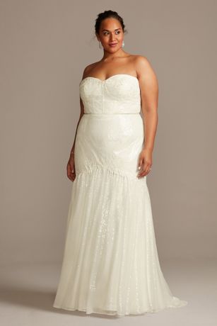 This allover sequin trumpet wedding dress is worth celebrating! Corset-style boning lends structure to the strapless bodice, while crystal embellished lace appliques, add extra dazzle.