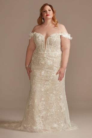Whether it's worn with just one shoulder, both straps, strapless, this sequin-strewn sheath wedding dress is perfect for the bride looking for versatility. Over 4,000 beads and six different shapes of floral appliques cover the dress, from the plunging neckline to the chapel train. Powermesh lining sits beneath the romantic lace layers to provide comfortable smoothing all day and night.