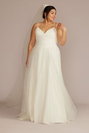 A breathtaking lace bodice gives way to a full tulle skirt in this Basque waist A-line wedding gown. Delicate spaghetti straps and an open back detail show off your wedding glow while accentuating the sweep train below.