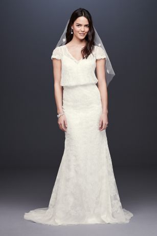 This romantic wedding gown features a beaded and embroidered blouson-bodice tulle sheath dress layered over a lustrous satin slip. The combination of the flattering silhouette, complete with cap sleeves and V-neckline, and gorgeous embellishment guarantees you"ll feel amazing on your wedding day.