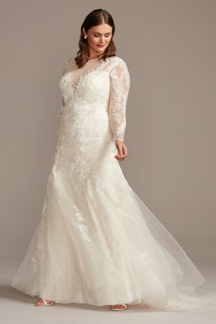 An opulent wedding dress that feels comfortable? Believe it. This long sleeve beaded lace mermaid gown is crafted of stretch illusion fabric, creating a light and easy look. Layered with textured, dotted net and subtle metallic gold appliques for dimension, and finished with an illusion plunge neckline.