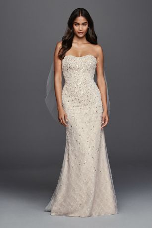 More than 12,000 beads and teardrop-shaped paillettes chicly catch the light on this strapless wedding dress. The lace underlayer imbues this chic sheath with subtle romance.
