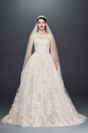 Yards of opulently beaded and appliqued tulle create softly folded pleats in the grand skirt of this stunning wedding dress. Covered in 5,000 beads and sequins, and finished with scalloped lace trim around the hemline, this Oleg Cassini ball gown is truly breathtaking to behold.