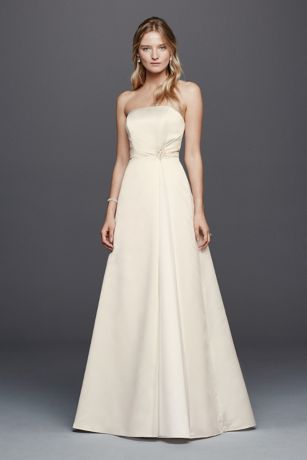 As a bride you have dreamed of your wedding day since you were a little girl. It is only fitting that you have a dress that fulfills your dreams and this strapless satin wedding dress will do just that! Featuring beaded embellishments , split front, and a figure flattering A-line silhouette this darling gown will have you glowing with wedding bliss.