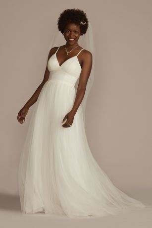Adorned with beautifully beaded spaghetti straps and a low back, this timeless tulle wedding dress is a flattering choice for every bride. Pleated tulle detailing and a wide waistband lend beautiful texture and shape to the bodice, while a sweep train adds graceful movement to the skirt.