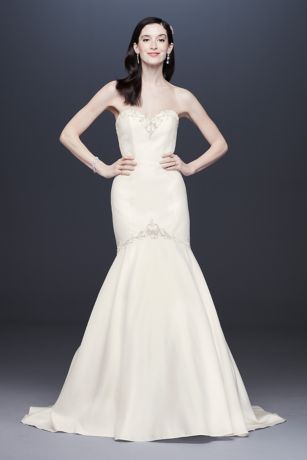 Smooth, sleek and sophisticated, this form-fitting strapless satin wedding gown features detailed beaded trim at the neckline and trumpet skirt. Layers of satin and tulle cascade to complete the mermaid silhouette.