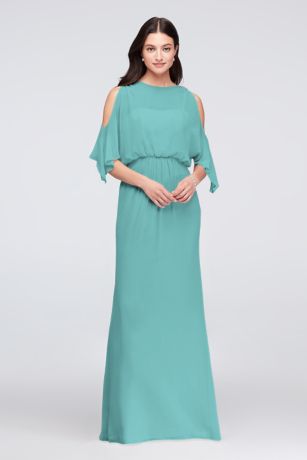 Topped with beading, this cold-shoulder chiffon bridesmaid dress flatters with a blouson bodice and flowing skirt.