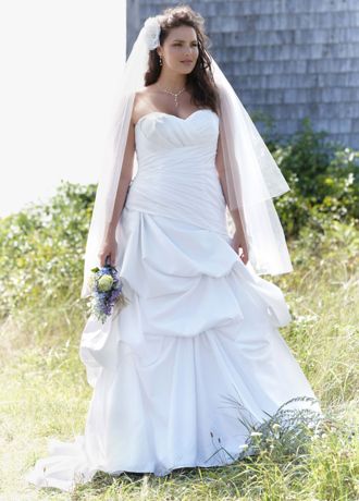 Stunning lines and graceful construction, this ball gown has it all. Simply perfect for the trend setting bride. Strapless satin wedding gown features dropped waist and pick-ups on skirt. Ruched bodice with corset back and sweetheart neckline provides a graceful finish. Sweep train.