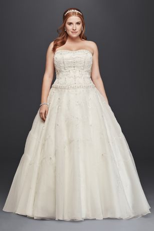 This beautiful extra length plus size wedding dress is a special value, with an emphasis on special. You'll feel admired and simply magnificent when you slip into the satin bodice, chapel train, and lavish organza ball gown skirt featuring beaded and embroidered details.