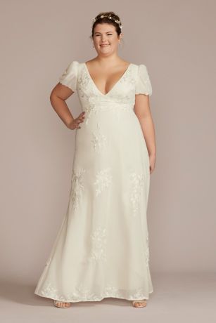 Your search for the perfect boho wedding dress is over! From the flowing skirt and puff sleeves to the allover floral appliques, each intricate detail of this V-neck, empire waist wedding gown is a call to nature and its unmatched beauty.