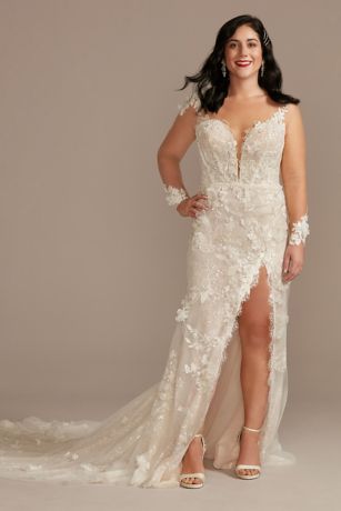 This illusion long-sleeve, ultra sexy wedding dress combines sultry sophistication with botanical details. Five types of 3D floral appliques embellish the wrists and shoulders and cascade down the dress. Features a plunge neckline, low back, ooh-la-la-worthy skirt slit, and bodysuit for comfort and smoothing.
