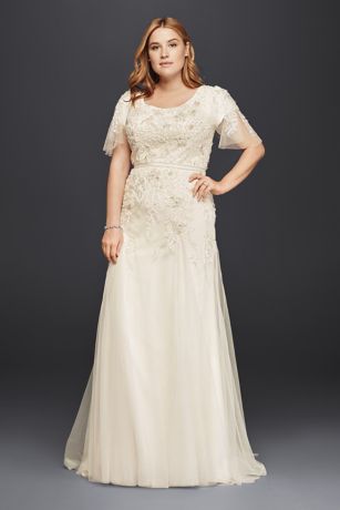 Won't it be lovely to gracefully float down the aisle? Celebrate romance in this plus size wedding dress with floral lace details, a soft net A-line skirt, and plenty of coverage
