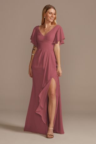 Soft flutter sleeves, a V-neckline, and a statement ruffle give this chiffon bridesmaid dress a modern boho feel.