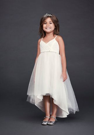 Tulle is pleated at the bodice of this sweet flower girl dress before floating into a wispy, high-low skirt. A crystal belt provides a sparkly finishing touch. Polyester. Back zipper; fully lined. Dry clean. Imported
