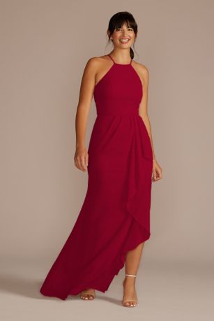 Sleek and refined, this high-neck chiffon bridesmaid dress features a gorgeous cascading ruffle, highlighted with a skirt slit.