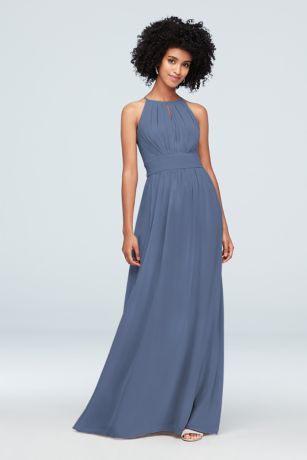 Graceful pleating and a keyhole neckline add extra elegance to this long chiffon bridesmaid dress. The ruched waistline provides figure-defining detail.
