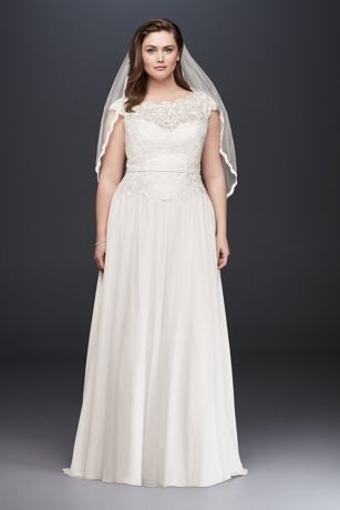 This soft A-line lace and chiffon wedding dress will make a beautiful first impression. The illusion lace bodice is softly scalloped at the waist and along the V-back, and the slim satin waistband is finished with a small bow. An easy-to-wear classic, this plus-size gown needs only a few special accessories to make it your own.