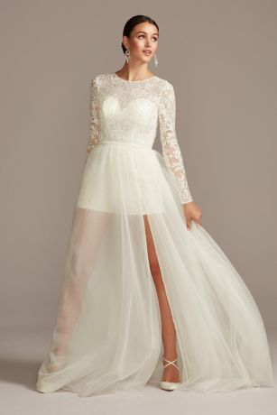Take a fashion-forward walk down the aisle in this captivating lace wedding romper and tulle overskirt. A thigh-high slit and illusion lace sleeves lend sexy detail to the sequin-strewn lace romper, while the removable sheer overskirt provides subtle coverage and adds an element of versatility to your wedding day or wedding event look.