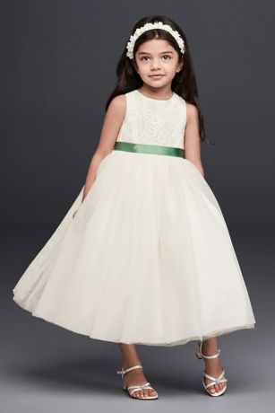 Twirl alert: This lace-bodice flower girl dress is finished with a fun and fluffy tulle skirt that she'll be excited to take for a spin on the dance floor.