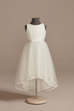 Featuring a sleeveless lace bodice and a satin-trimmed, high-low tulle skirt, this flower girl dress will look absolutely stunning on your favorite little lady. A satin bow at the waist adds the perfect finishing touch.