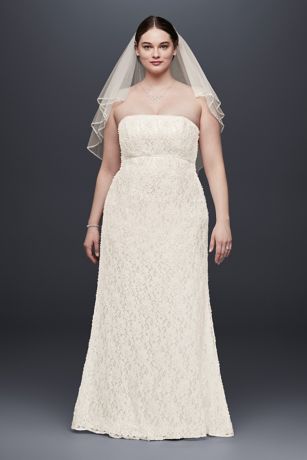 Featuring a pearl-trimmed empire waist and allover pearl beading, this lace sheath plus-size wedding dress is an effortlessly elegant choice for your big day.
