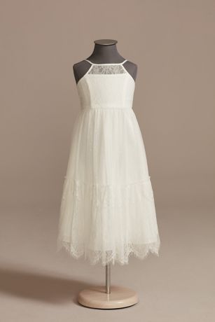 Perfect for a boho wedding, this vintage-inspired flower girl dress features an illusion halter neckline, a stunning keyhole tie-back, and an ankle-length skirt trimmed in tiers of Chantilly lace.