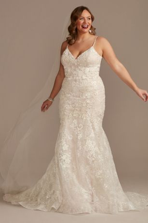 Adorned with over 1,500 beads and sequins, from the plunging neckline to the mermaid hem, this lace spaghetti strap wedding dress is the epitome of beauty. Crinkle chiffon 3D flowers add beautiful texture, while a low back and a chapel train complete the look with dramatic details.