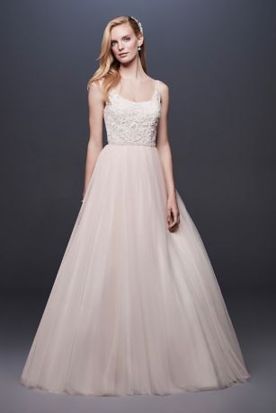 A skirt crafted of tulle, netting, and crinkle chiffon swishes below a pearl beaded lace bodice on this classic ball gown wedding dress. Sheer tulle tank straps and a slim ribbon sash add graceful finishing touches.