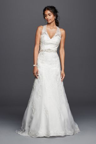 Striking details make this classic tulle A-line wedding dress gorgeous from every angle. Beaded lace appliques adorn the bodice and scatter down the skirt, while two keyholes double the back drama.