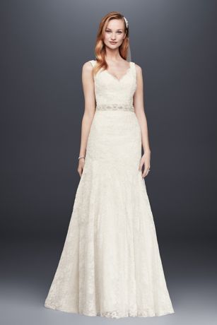This elegant lace trumpet gown is truly lovely. Finished with allover beading, the scalloped V-neck wedding dress dips low at the back and flares into a soft skirt.