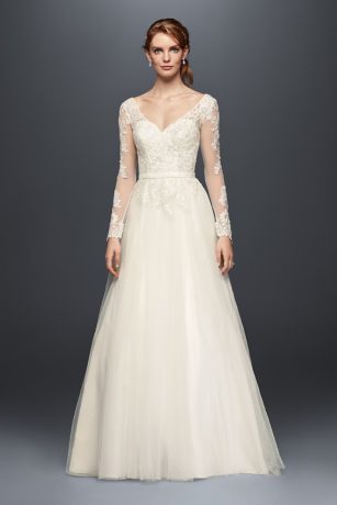 Illusion mesh sleeves strike a lovely balance between covered and bare, particularly when paired with a flattering, wide-set V-neck and low back. The A-line tulle skirt adds a softly voluminous finish.