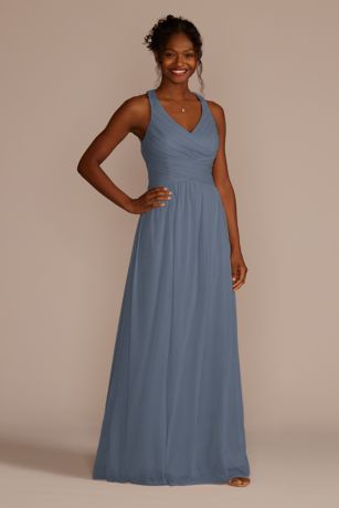 This stunning long bridesmaid dress features elegant crisscross back straps that add a touch of sophistication to any bridal party. The flowing fabric drapes beautifully, creating a flattering silhouette for all body types. Whether you're walking down the aisle or dancing the night away, this dress is sure to make you feel like a princess. Available in a variety of colors to match any wedding theme, this back strap dress is a versatile and timeless choice for any bridesmaid. Make a statement with this gorgeous gown from David's Bridal.