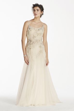Won't it be lovely to gracefully float down the aisle? Celebrate romance in this wedding dress with floral lace details, a soft net A-line skirt, and slim spaghetti straps.