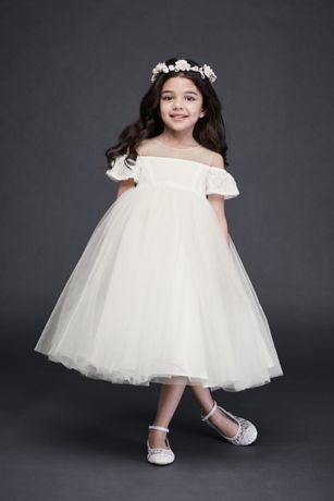 The perfect counterpart to the boho bride, she'll be carefree and captivating in this illusion off-the-shoulder flower girl dress with a lace bodice and full tulle skirt. Polyester and nylon. Back zipper, fully lined. Dry clean. Imported.
