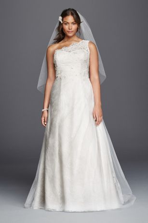 A scalloped lace one-shoulder gown makes a chic statement. This A-line wedding dress is completely classic, with tulle layered over lace for a skirt that moves with airy grace.