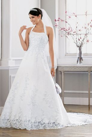 Satin halter A-line gown with beaded lace applique and cut-out-lace hem.