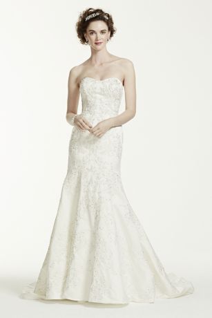 Beautifully designed, this romantic wedding dress features a strapless satin bodice adorned with gorgeous lace appliques. A figure-flattering trumpet skirt completes this stunning bridal look.