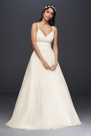 A ball gown for a beach wedding? You'll believe it's possible once you slip on this light-as-air tulle creation. The pleated bodice features double spaghetti straps, a flattering deep V-neckline and a figure-cinching wide waistband. The full, sweeping skirt provides a classic finish for even the most laidback celebrations.