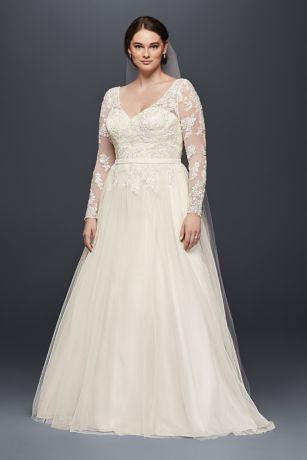 Illusion mesh sleeves strike a lovely balance between covered and bare, particularly when paired with a flattering, wide-set V-neck and low back. The A-line tulle skirt adds a softly voluminous finish.