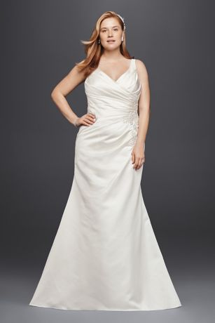 Silky satin pleating adorns the bodice of this ruched mermaid wedding dress. Designed with sweet details, this beautiful plus size wedding gown has a V-neckline, tank straps, lace appliques at the hip, and finishes with back buttons.
