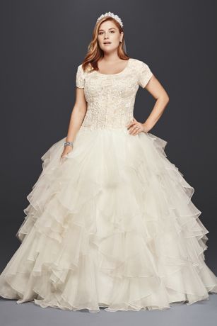 This modest ball gown is both demure and dazzling. The neckline and short sleeves give you stylish coverage, and the beaded lace bodice and dramatic ruffled skirt are nothing short of breathtaking.