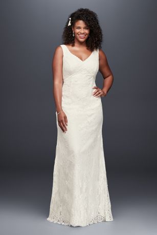 What's not to love about this floral lace wedding dress? The sleeveless plus-size sheath gown features an empire waist with grosgrain ribbon, a flattering V-neckline, and a keyhole back making it a perfect choice for your destination wedding.