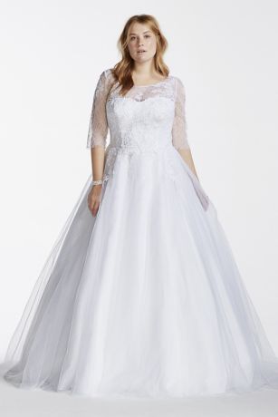 You'll be a vision in white (or ivory) in this tulle ball gown with a lace illusion bodice. This lovely dress has 45 expertly detailed yards of fabric with lace appliques, boatneck, three-quarter sleeves, and a sweep train.