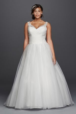 Your wedding day is one of the most important and meaningful days in your life. Choose a dress that best expresses you. This stunning classic dropped waist tulle plus size ball gown with dramatic beaded lace appliques adorning the illusion tank straps just may be your winner!