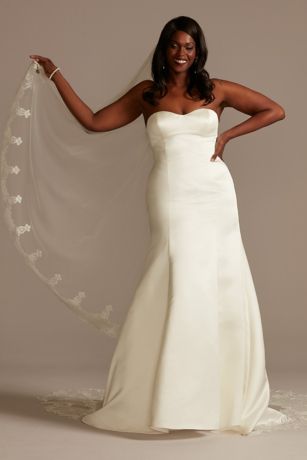 You may be mistaken for royalty when wearing this strapless satin wedding dress. It's clean-lined and unadorned except for covered buttons that cascade to reveal a dramatic, cathedral-length train, crafted from delicate scalloped lace.