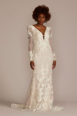 Elevate your bridal glamour in a fully beaded sheath wedding gown. Pouf shoulders add regal detail to the lace-adorned long sleeves while a dramatic 100 inch chapel train spills from beneath a daring open-back. This gown is lined in power mesh ensuring a supportive, figure-flattering silhouette for every bride and topped with a horsehair hemline that lays perfectly, every time.