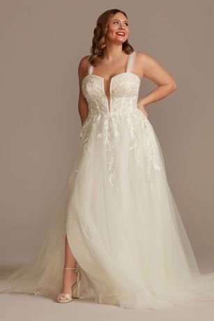 150 petal appliques adorn the plunging bodice and trail down the tulle A-line skirt of this stunning plus-size wedding dress. Removable tulle straps allow you customize the dress to your preferences. Charming slits are perfect for showing off some fancy footwear.