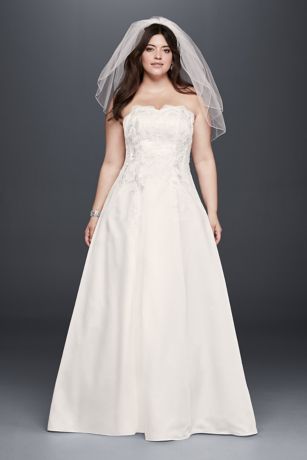 This plus size A-line wedding dress is the very picture of classic beauty. The straight strapless neckline and sleek satin skirt hint at modernity, while lace appliques and a chapel train make it a style that will stand the test of time.