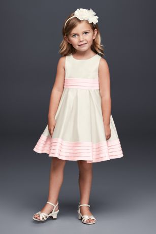 Want your little miss to match your 'maids? This classic satin flower girl dress features a pleated waistband and hemline that coordinates perfectly with our bridesmaid dress colors.